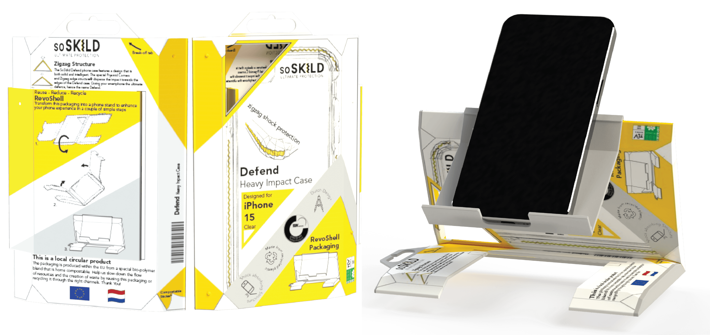 This is the final bachelor project (DP5) of the Industrial Design Engineering Bachelor. This project is the capstone to my bachelor’s degree to achieve a Cum Laude graduation with Honours. This project was executed as assignment for Mconomy for their brand SoSkild, a phone accessory brand. Mconomy challenged us to create the innovation of today with the story for tomorrow. My research and methods have led me to answer this challenge with future of packaging, by slowing the flow of resources and reducing waste towards true circularity.
